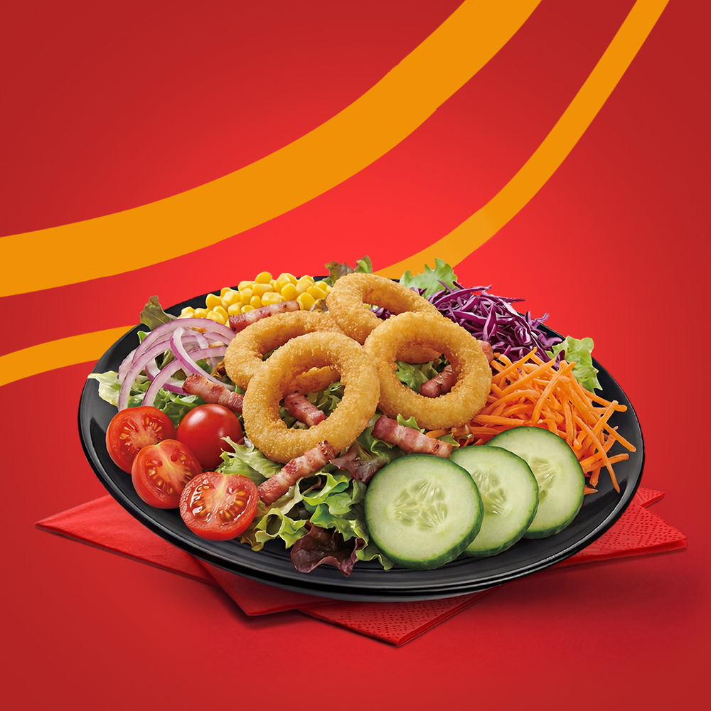 Onion rings, lardons grillés, salade, tomates cerise, maïs, carotte râpée, concombre, oignons et chou rouge
