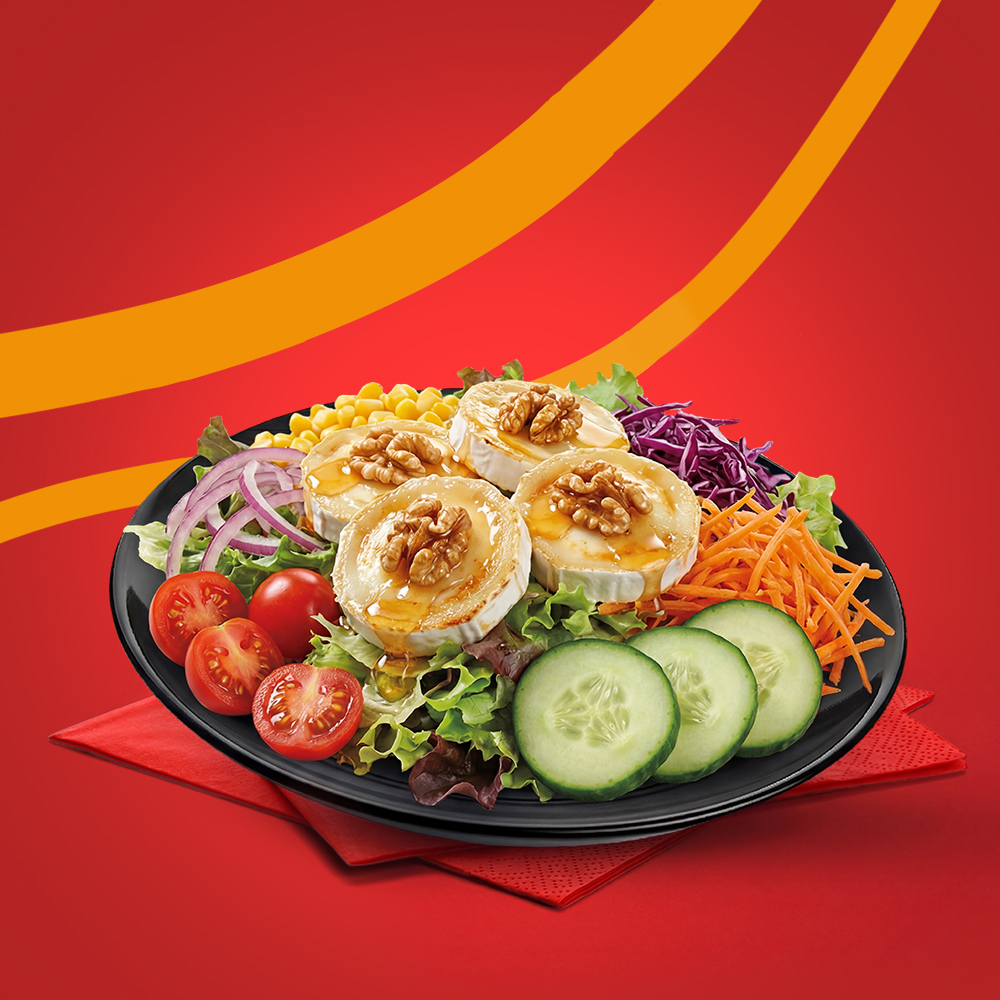 Rondelles de chèvre, miel, cerneaux de noix, salade, tomates cerise, oignons, maïs, carotte râpée, chou rouge et concombre