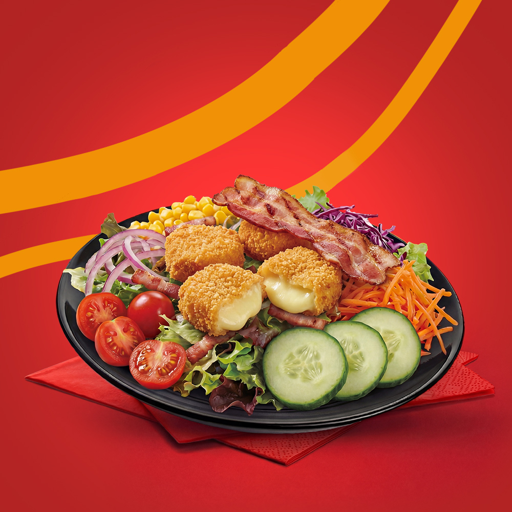 Bouchées de camembert, bacon grillé, salade, tomates cerise, concombre, maïs, carotte râpée, oignons et chou rouge